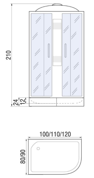 Душевая кабина со средним поддоном 24 см, глубина поддона 12 см, съемный экран, крыша, верхний душ, вентиляционные отверстия (2шт.), центральная стойка, ручной душ, 3-х позиционная лейка, держатель для лейки, полочка, смеситель с переключением режимов, cифон. Откидное сиденье - дополнительная опция. Передняя часть: матовое стекло, профиль матовый хром, задняя стенка: матовое стекло. Сборка производится без применения силикона!