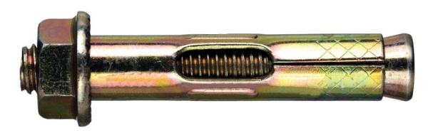 Описание: двухраспорный анкер представлен довольно сложной конструкцией. Он состоит из 2х или 3х стальных гильз (в зависимости от длинны анкера) две из которых имеют распорную часть что обеспечивает более надежное крепление. На шпильку, которая располагается внутри гильз, с одной стороны наворачивается гайка шестигранная, иногда с на прессованной шайбой, а с другой конусная распорная часть с внутренней резьбой.